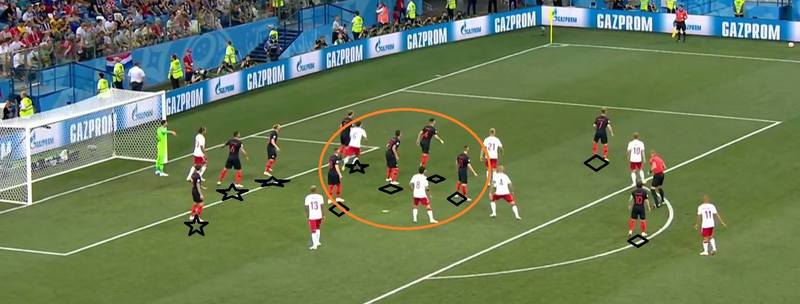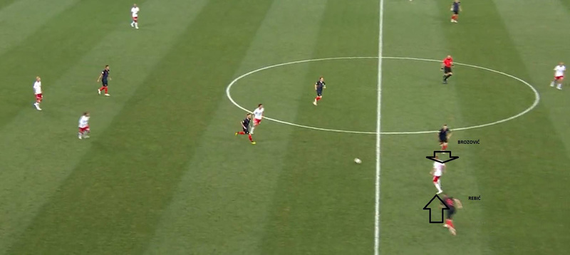Na gornjoj slici vidimo kako se Brozović i Rebić odmah kreću prema Eriksenu čim je lopta upućena prema njemu što ga tjera na odigravanje prema natrag.