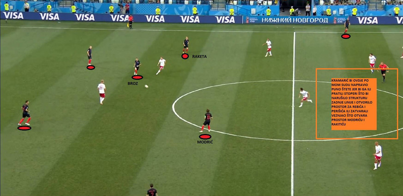 Prvo, često se događalo da svi vezni igrači, i Brozović i Rakitić i Modrić stoje ili u liniji ili jedan kraj drugog, a jednostavna matematika kaže da ako imaš sedam igrača na svojoj polovici, onda imaš samo tri naprijed, od čega dva krila i jednog napadača udaljenog previše od zbivanja. Kome ćeš dodati/proslijediti loptu? Natrag ili bekovima, druge nema. Odnosno, ima, duga lopta prema naprijed ili na krilo. Tako smo zapravo gledali utakmicu u kojoj smo imali gotovo jednak broj dugih lopti kao i Danci, a kad uzmemo da je njima duel i skok nešto što vole, mi smo zapravo trošili svoj posjed bezveze. Dancima smo takvom "organizacijom" napada uvelike olakšali obrambene zadaće: apsolutno nitko iza leđa njihove vezne linije. Dalić je nakon utakmice izjavio kako je rekao igračima da ne smiju primiti gol u prvih 15 minuta i da nabiju koju ako treba. Bome, nabili su.