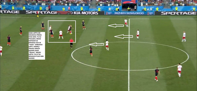 Budući da Danci igraju duge lopte, posebno na Poulsena koji dominira nad bekovima, mi smo većinu utakmice - uz povremene izlete u presing - proveli u 4-1-4-1 zonskoj obrani. Samo jedan primjer danskog masterplana je sljedeća slika.
